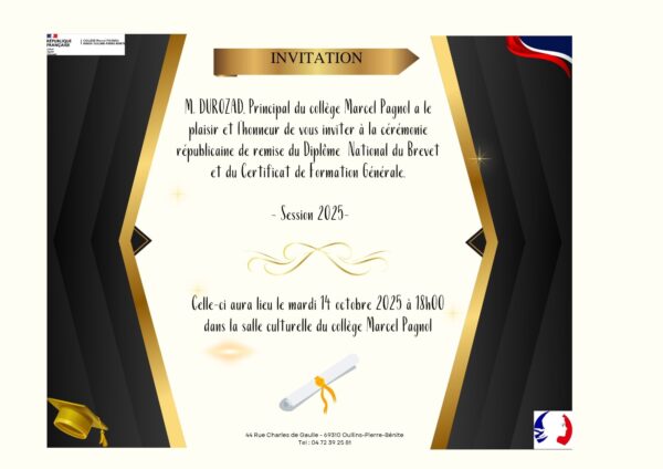 Mesdames, Messieurs, Chers Parents, Chers Elèves de la session 2025 DNB, CFG, DELF, Nous avons décidé de poursuivre pour une seconde édition la cérémonie traditionnelle républicaine de remise des diplômes du DNB et du CFG. Nous pouvons nous enorgueillir d’avoir… Continue Reading →